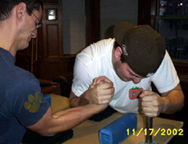 “The hook is the most common move in arm wrestling. You are probably familiar with the hook, because it is the move that is used when arm wrestling is portrayed in bars and elsewhere on TV. It is considered an “inside” move, meaning you are trying to beat your opponent’s arm instead of his hand (as you do in a toproll). To be successful in a hook, you should be stronger than or at least equal to the strength level of your opponent. You need not have as good a bench press or squat as your opponent, because this strength counts very little in arm wrestling. Instead, try to gauge your forearm and bicep strength against that of your opponent. If you believe that you are not as strong as him or her, try toprolling instead. If, on the other hand, you compare favorably to your opponent, you can really blast him in an impressive manner with the hook.
